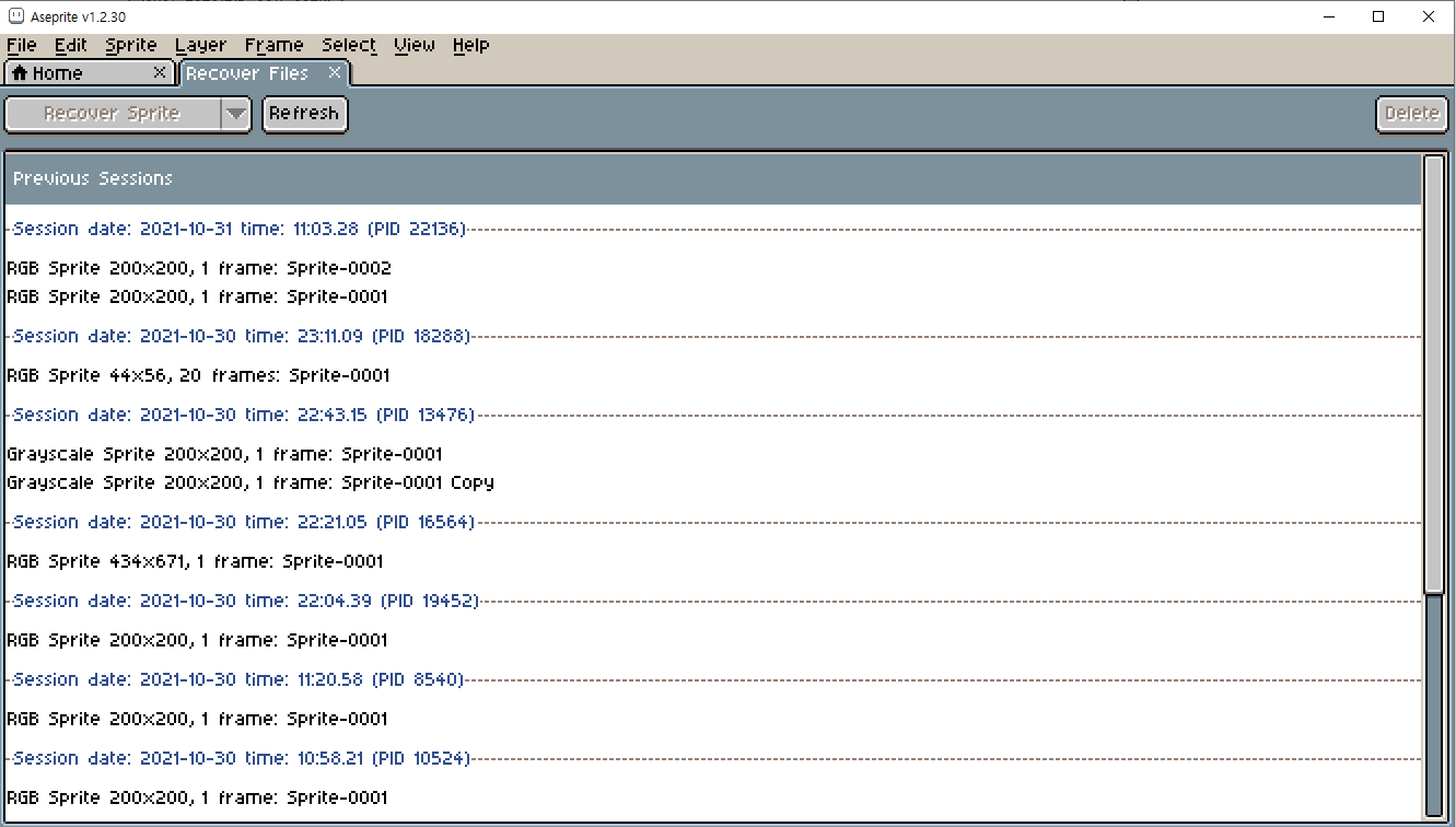 : 이전 작업 중 (정상적으로 저장되지 못한) 충돌한 세션(Crashed Sessions)이나 닫힌 Aseprite에서 이전 세션에 저장되지 않은 파일을 복구한다.