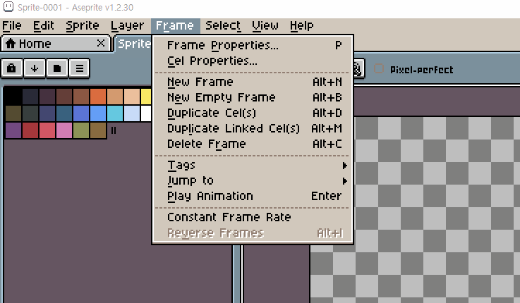 이제 File, Edit, Sprite, Layer 메뉴까지 알아봤다. 이번에는 Frame, Select 메뉴를 알아본다.