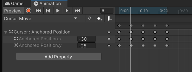 Animation 창에서 Add Property를 눌러 원하는 타입의 프레임을 추가한다. 위치를 조작할 때, Anchor가 적용된 UI는 Anchored Position 선택한다. (x축 y축 z축(2d일 때는 x)을 조작한다.)