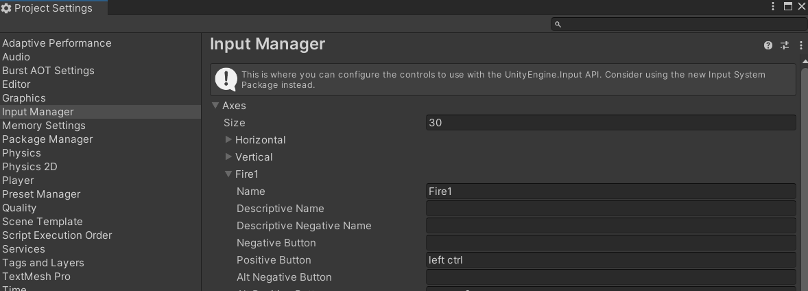 유니티에서는 'Fire1'이라는 기본 버튼도 제공하는데, Fire1 버튼을 눌렀을 때 총알이 나가도록 한다. (마우스 왼쪽버튼 또는 왼쪽 ctrl)