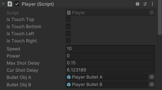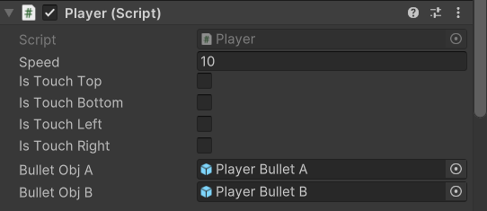 게임 시작할 때 처음에는 총알이 없다. 그래서 총알 만드는 로직을 작성한다. Player 스크립트에서 총알 프리펩을 저장할 변수를 생성한다. (bulletObjA, bulletObjB)