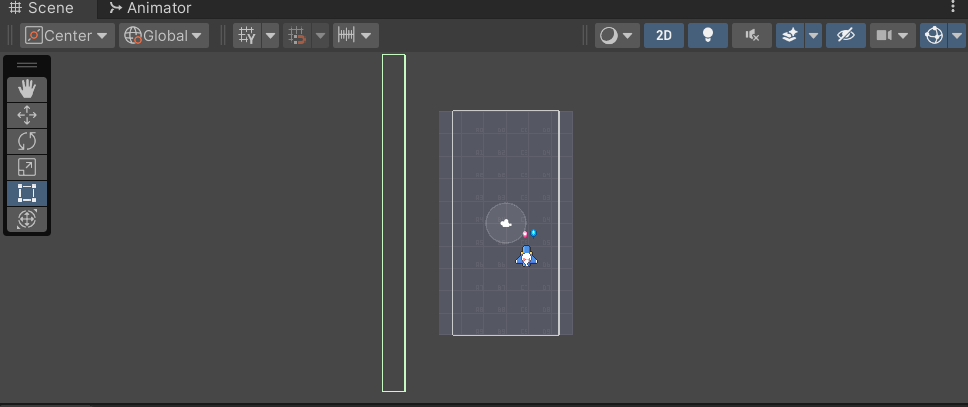 주어진 에셋 아틀라스에서 첫번째 sprite를 Scene에 드래그한다. 그리고 이 총알 오브젝트(Player Bullet A)에 충돌 이벤트를 위한 콜라이더 컴포넌트와 Rigidbody 2D 컴포넌트를 생성한다.