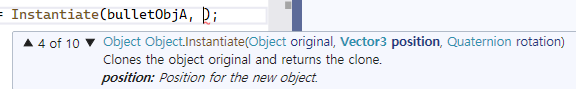 여러 오버로드의 Instantiate() 함수에서 사용할 타입은 4번째이다. (프리펩 오브젝트, 생성될 위치, 생성된 오브젝트의 방향)