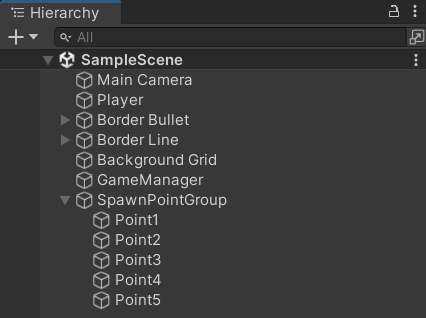 그리고 적 비행기 프리펩을 생성시켜줄 위치가 있어야하는데, 5개의 좌표를 잡아서 랜덤하게 소환하도록 한다.