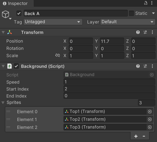 그리고 각자 2개씩 더 복사해서 총 3개씩 sprite 오브젝트를 생성한다. (지금 Back A의 하위 Top1, Top2, Top3는 다 같은 sprite인 상황) 이제 1번대 하위 오브젝트의 y축은 모두 -12으로 값을 설정한다. : 한 블럭만큼 아래로 내려온다.