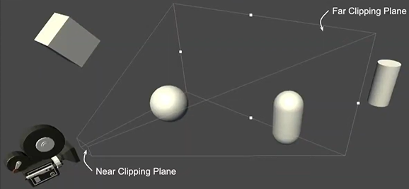 Frustum Culling은 3DProject에서 카메라 오브젝트를 클릭해보면 확인해볼 수 있다. 그리고 Camera의 속성에서 Clipping Plane의 Near와 Far 설정값을 확인할 수 있다. Frustum 영역 바깥, 혹은 Near보다 앞에있거나 Far보다 뒤에 있는 오브젝트는 그리지 않고 오직 Frustum 영역 안에 있거나 겹쳐있는 오브젝트만 그린다.