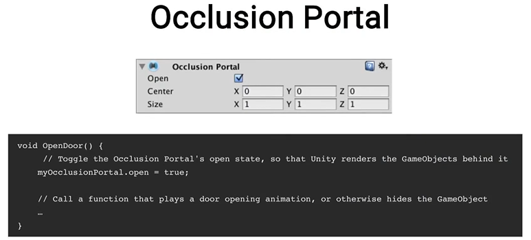 InDoor는 문을 닫으면 안보이고, 문을 열면 보이는 Occlusion Portal이라는 개념이 있는데, 문 오브젝트에다가 Occlusion Portal이라는 컴포넌트를 추가해주고, 문을 열게되면 .open = true가 되고, 문을 닫게되면 .open = false로 설정해주면 연산할지 안할지 설정해줄 수 있다. 동적으로 움직이는 occluder는 불가능하지만, 정적인 것은 가능하다. (on/off)